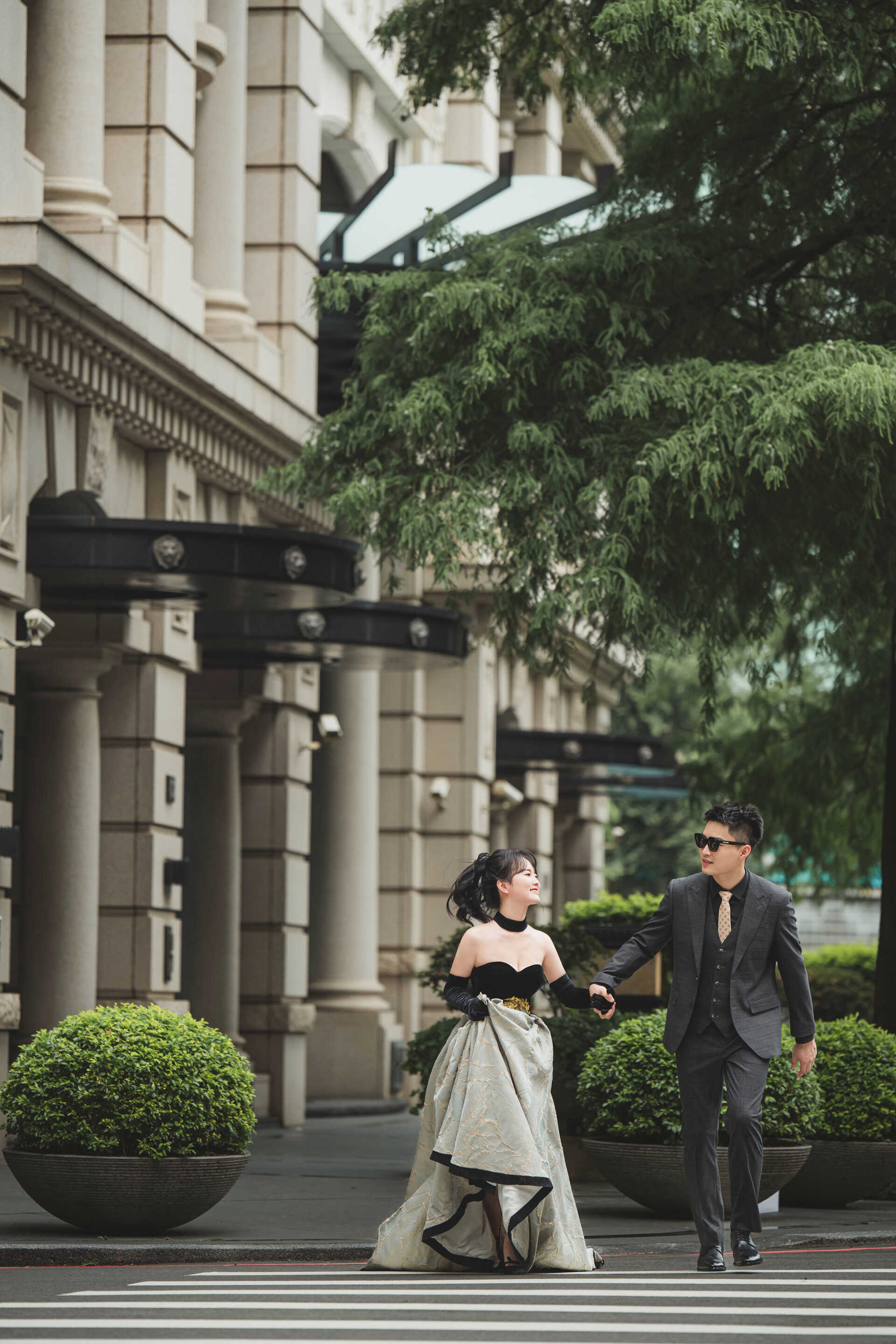 禮服建議選擇線條乾淨的緞面或絲質婚紗,搭配 A-Line 或蓬裙剪裁,在行走與站立之間撐起俐落輪廓。深色系或低彩度設計,能讓畫面更集中,氣場也更加鮮明。