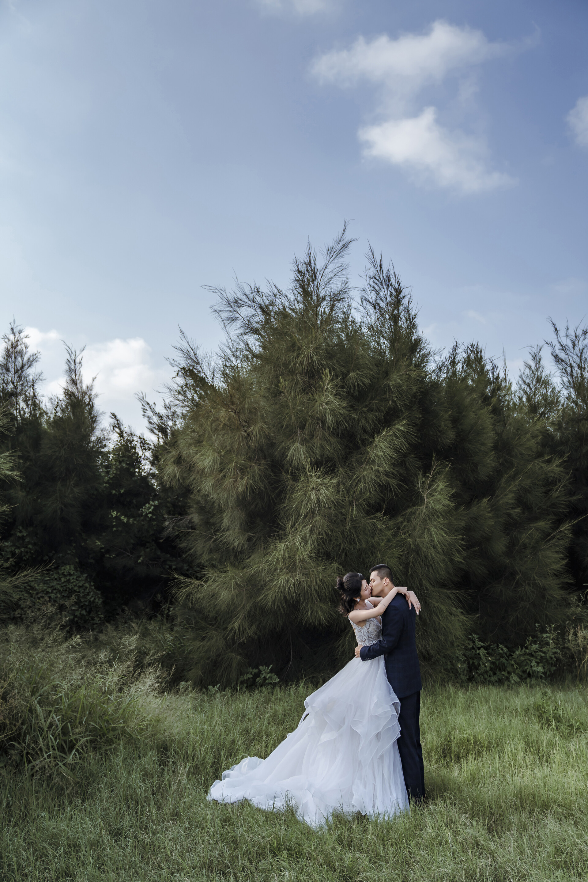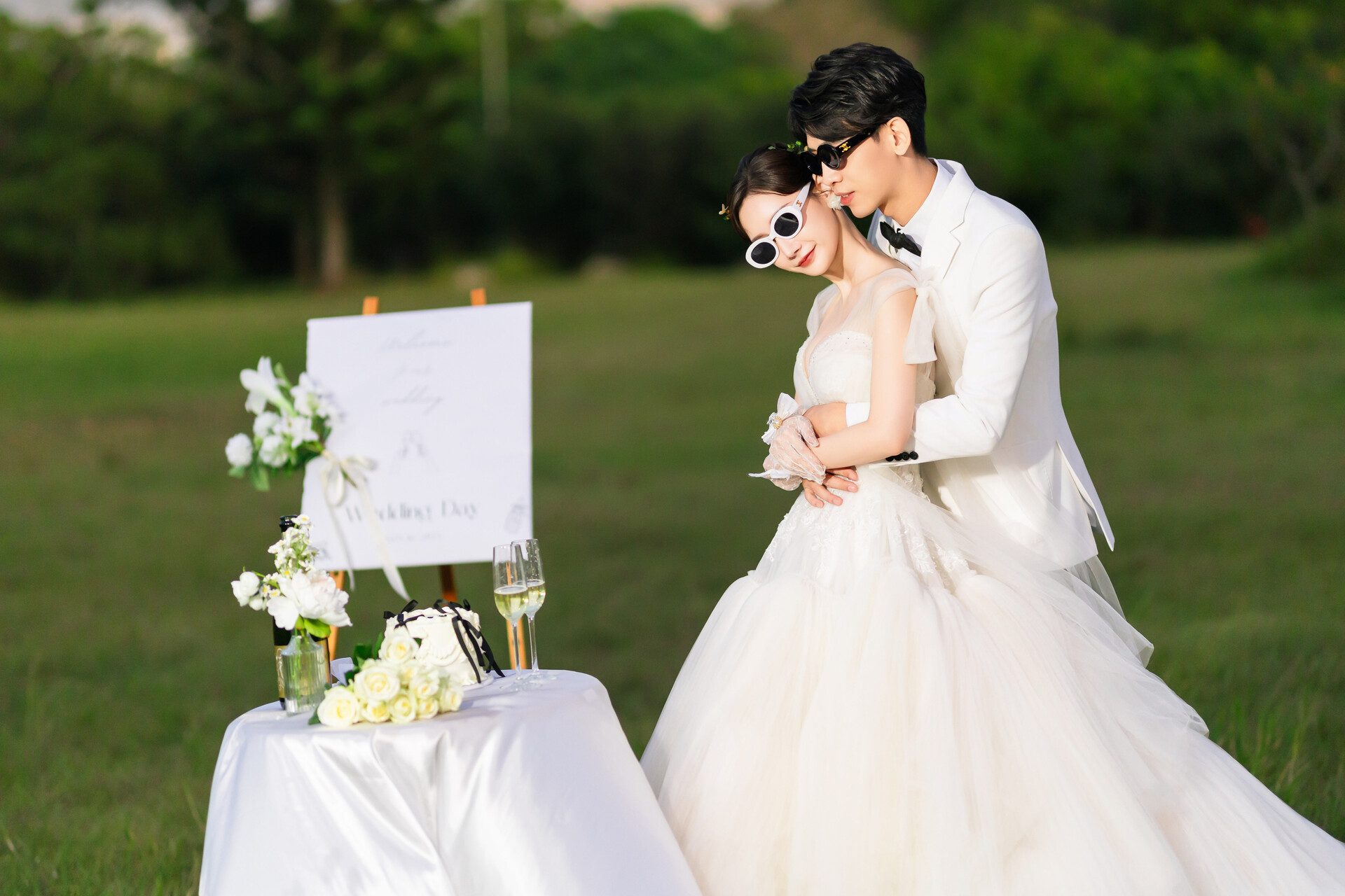 選擇輕盈紗質、柔軟飄逸的禮服最能襯托草地的自由感;蓬裙白紗、黑紗、或是淡藍、淡粉色的禮服,都能與陽光的色溫完美融合,呈現乾淨、空氣感的浪漫。